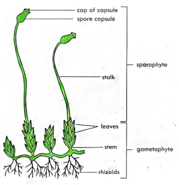 - The rhizoids, “stem,” and “leaves” together constitute the gametophyte.