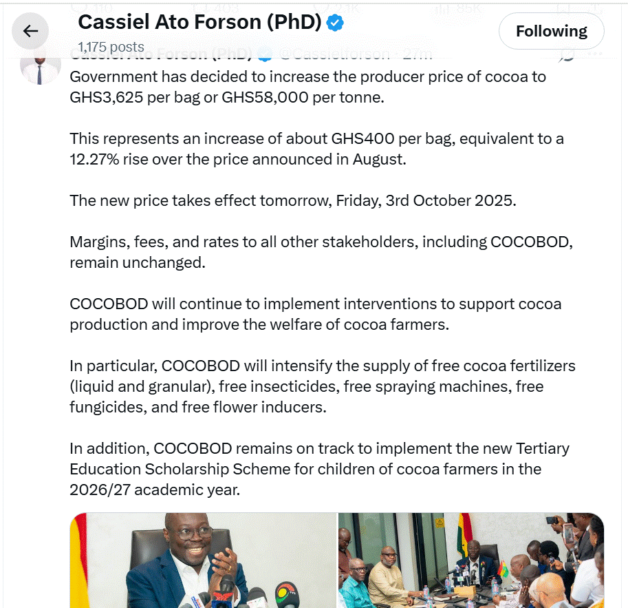 The Minister of Finance said this after announcing on Thursday, October 2, that the government has decided to increase the producer price of cocoa to GHS3,625 per bag or GHS58,000 per tonne.