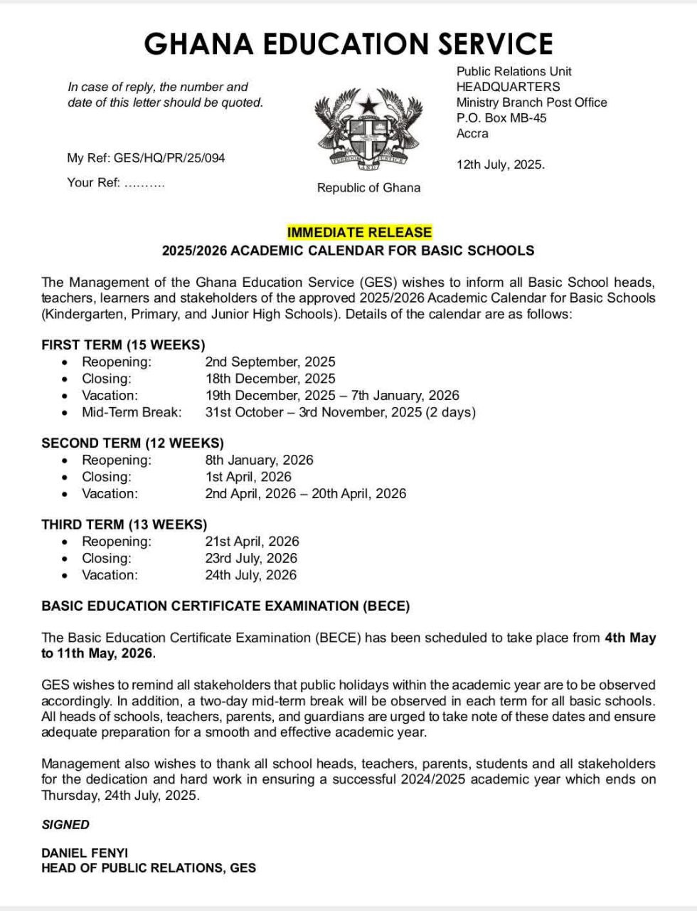 GES wishes to remind all stakeholders that public holidays within the academic year are to be observed accordingly. In addition, a two-day mid-term break will be observed in each term for all basic schools. All heads of schools, teachers, parents, and guardians are urged to take note of these dates and ensure adequate preparation for a smooth and effective academic year.