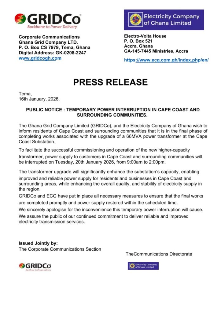The Ghana Grid Company Limited (GRIDCo) and the Electricity Company of Ghana (ECG) have announced a 5-hour temporary power outage on Tuesday, January 20, 2026, in Cape Coast and surrounding communities.