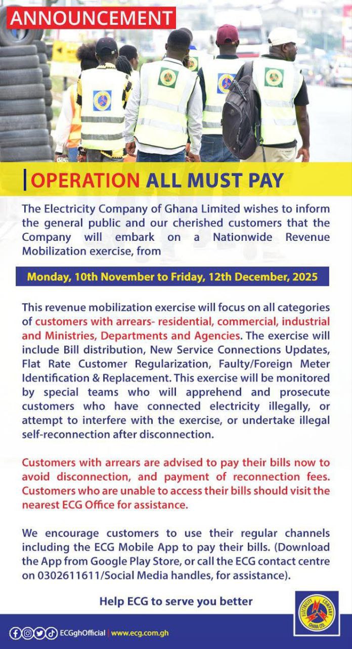 ECG To Embark on Operation All Must Pay Monday, 10th November to Friday, 12th December, 2025.