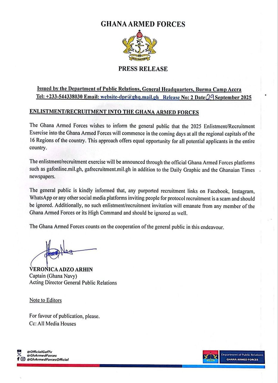 The Ghana Armed Forces wishes to inform the general public that the 2025 Enlistment/Recruitment Exercise into the Ghana Armed Forces will commence in the coming days at all the regional capitals of the 16 Regions of the country.