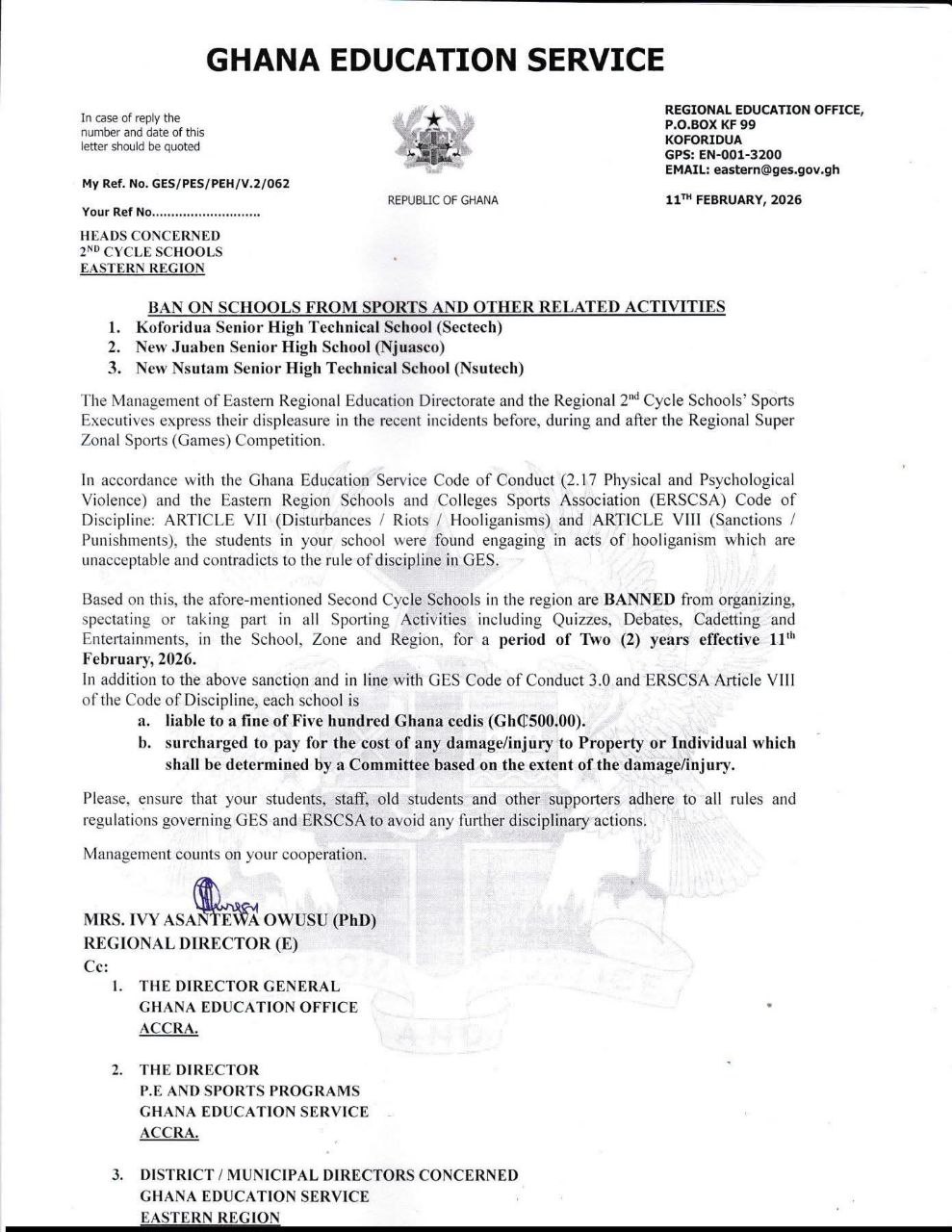 Please, ensure that your students, staff, old students and other supporters adhere to all rules and regulations governing GES and ERSCSA to avoid any further disciplinary actions.