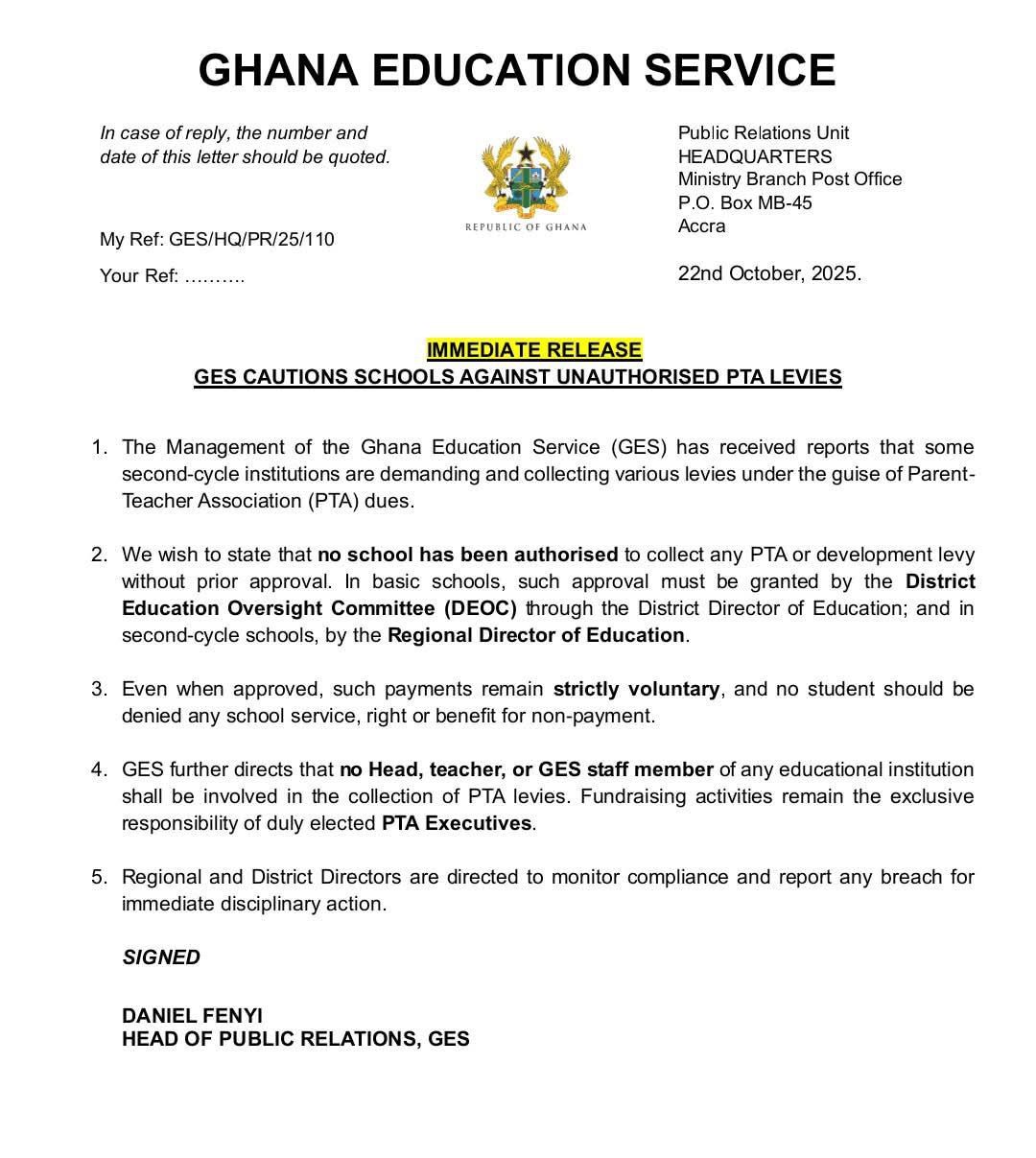 We wish to state that no school has been authorized to collect any PTA or development levy without prior approval. In basic schools, such approval must be granted by the District Education Oversight Committee (DEOC) through the District Director of Education; and in second-cycle schools, by the Regional Director of Education.