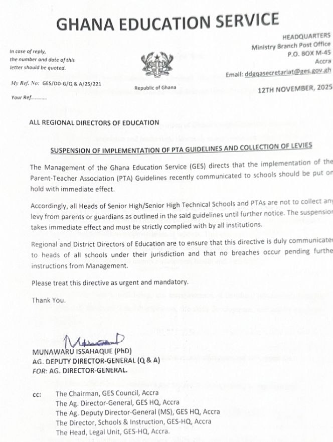 The Ghana Education Service (GES) has suspended the implementation of the Parent-Teacher-Association (PTA) Guidelines, including the collection of levies.