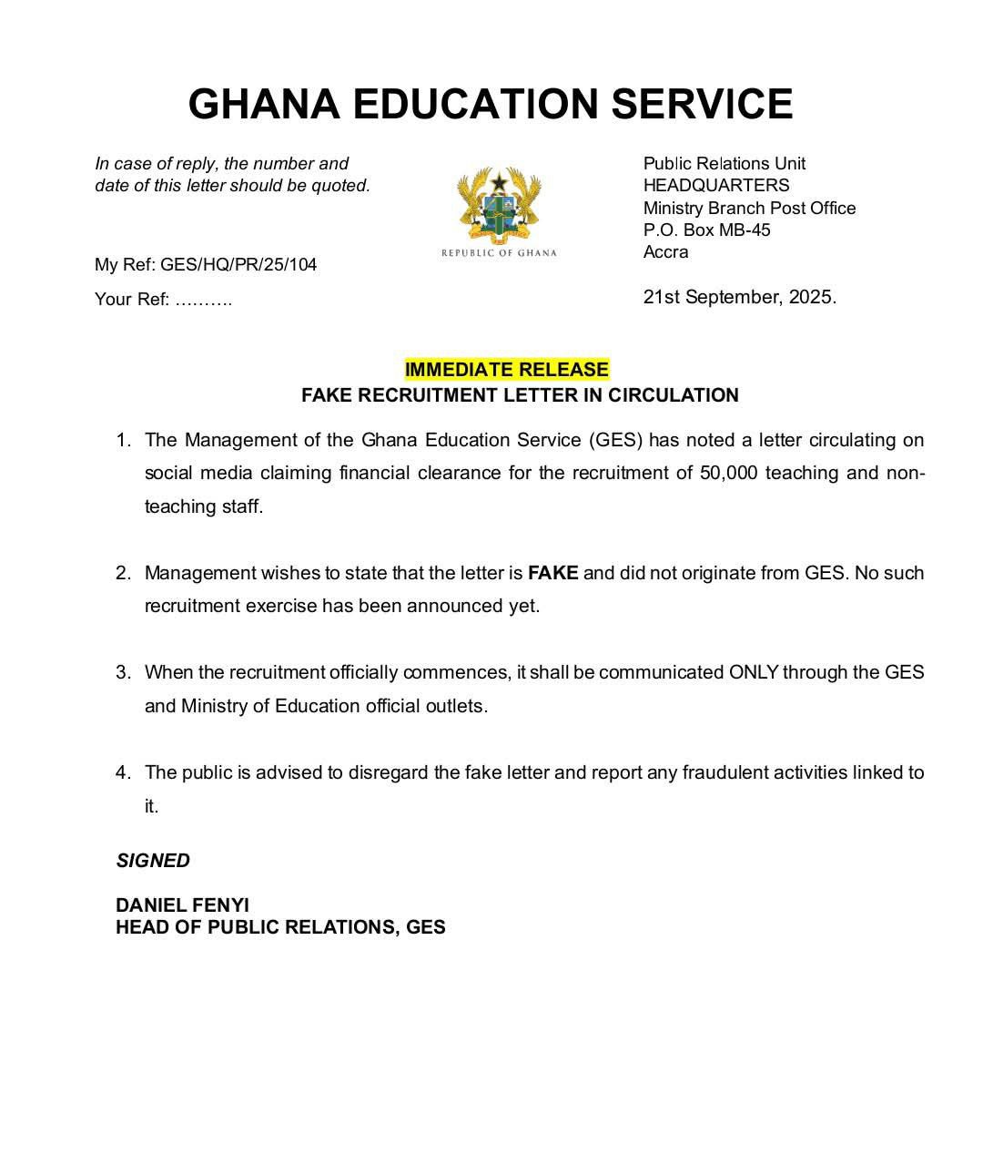 GES Warns the Public Against Fake Recruitment Letters in Circulation.
