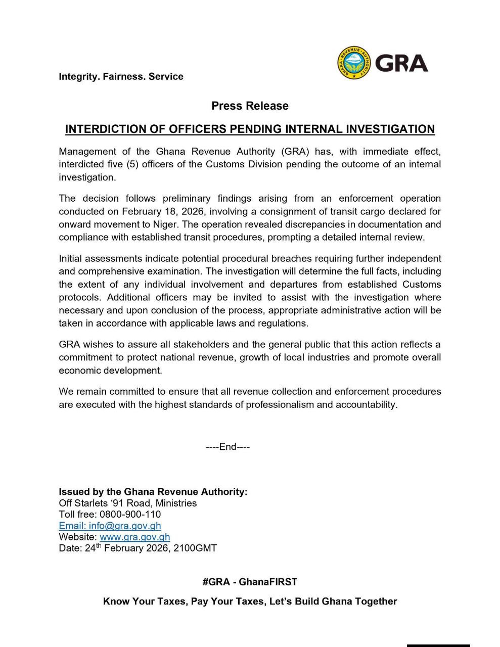The Ghana Revenue Authority (GRA) has interdicted five officers of its Customs Division with immediate effect, pending the outcome of an internal investigation into suspected procedural breaches involving transit cargo.