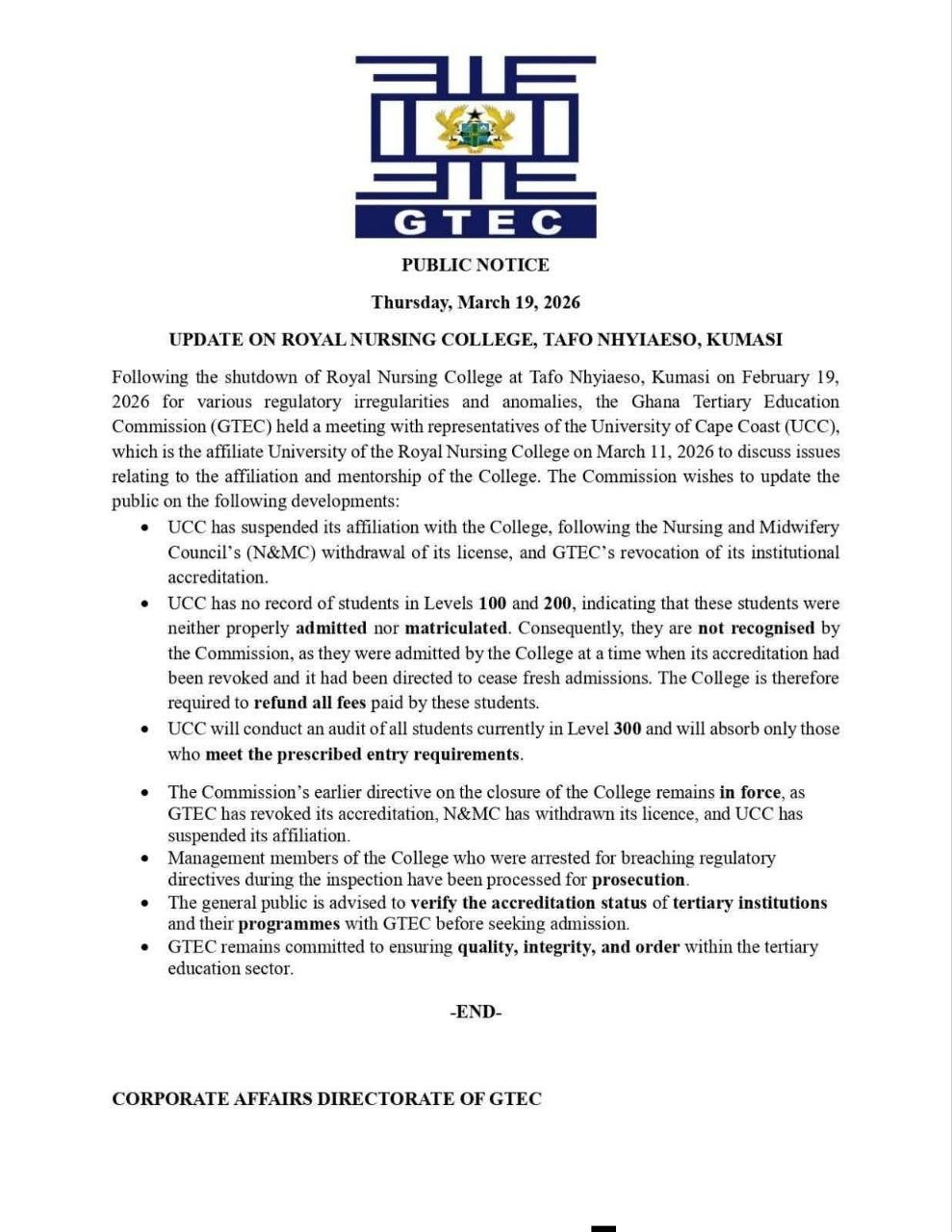 The Commission further disclosed that UCC has suspended its affiliation with the college following the withdrawal of its licence by the Nursing and Midwifery Council, as well as GTEC’s decision to revoke the institution’s accreditation.