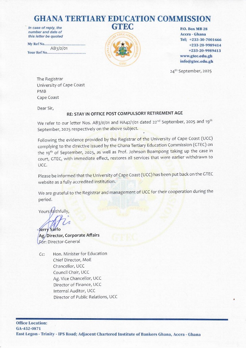 The decision comes just days after GTEC withdrew services to the university on September 19, citing Vice Chancellor Professor Johnson Nyarko Boampong’s refusal to comply with its directive on compulsory retirement age.