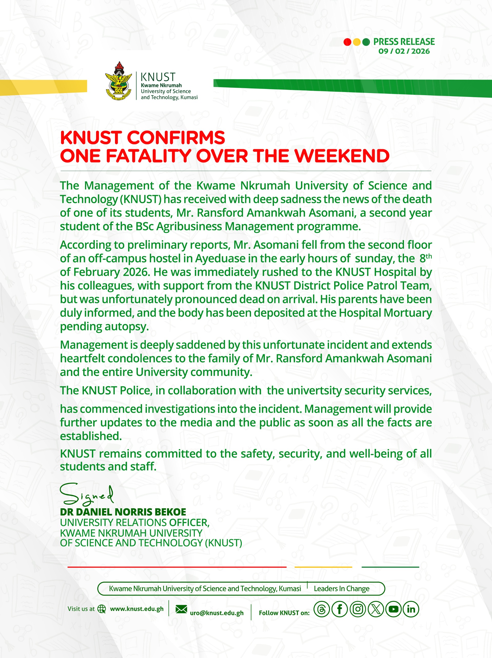 According to preliminary reports, Mr. Asomani fell from the second floor of an off-campus hostel at Ayeduase in the early hours of Sunday, February 8, 2026. He was rushed to the KNUST Hospital by his colleagues, with assistance from the KNUST District Police Patrol Team, but was pronounced dead on arrival.