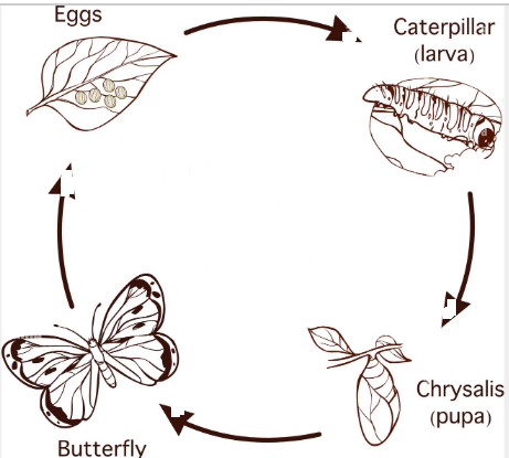 - A butterfly undergoes a complete metamorphosis during its life cycle. (Eggs, larva (caterpillar), pupa, and imago)