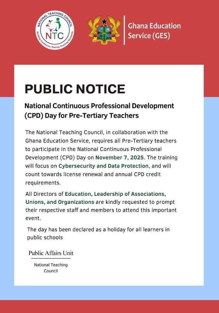 The National Teaching Council, in collaboration with the Ghana Education Service, requires all Pre-Tertiary teachers to participate in the National Continuous Professional Development (CPD) Day on November 7, 2025.