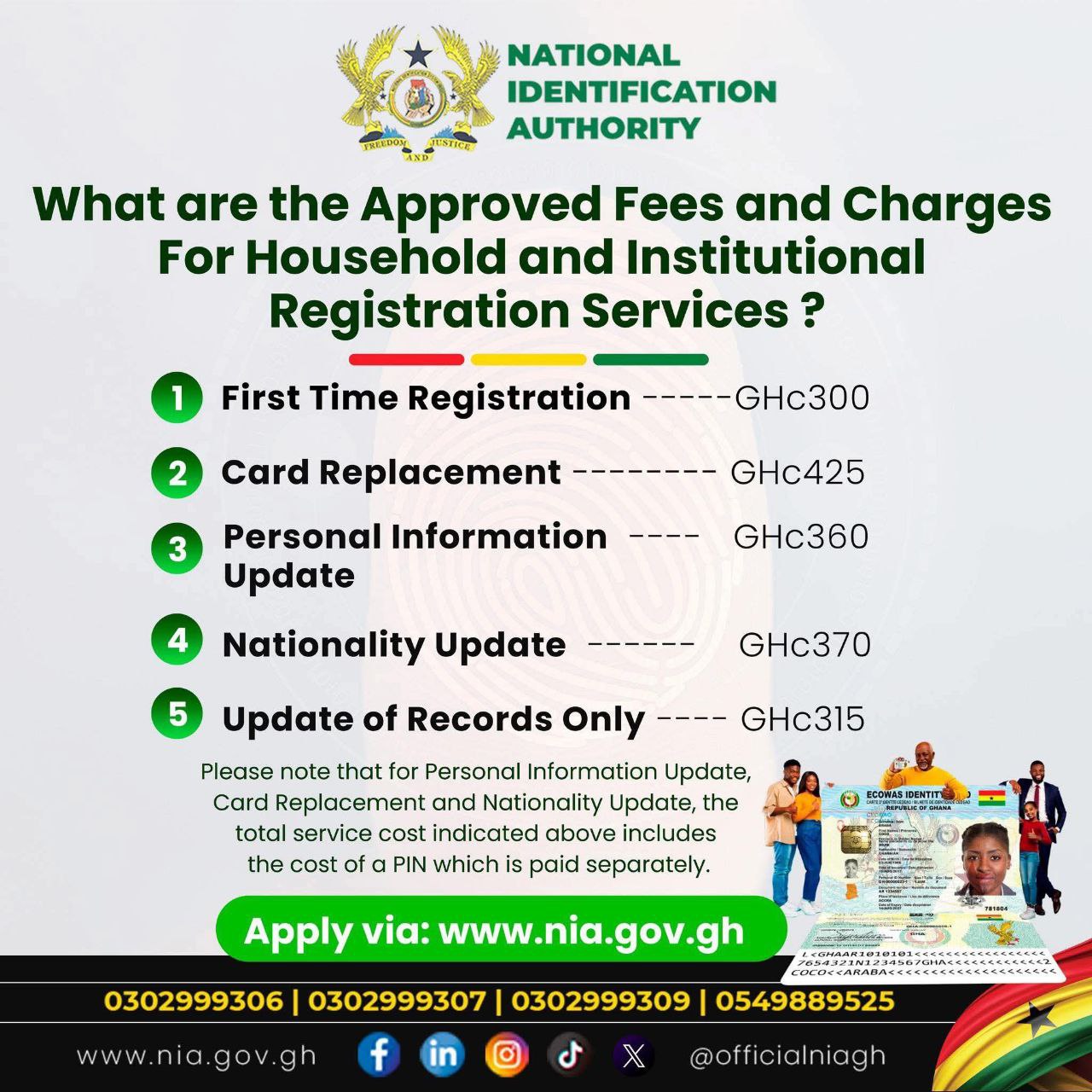National Identification Authority: The Approved Fees for Household and Institutional Registration Services for Ghana Card.