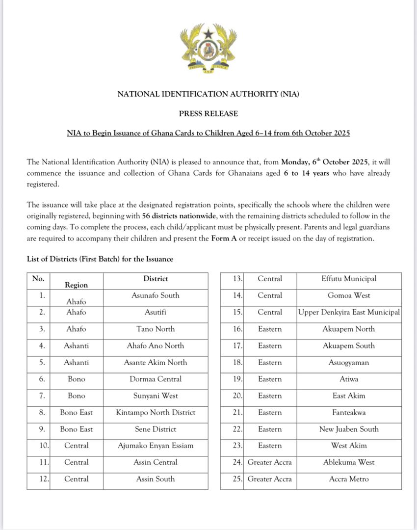The National Identification Authority (NIA) has announced that it will begin issuing Ghana Cards to children aged 6 to 14 years starting Monday, October 6, 2025.