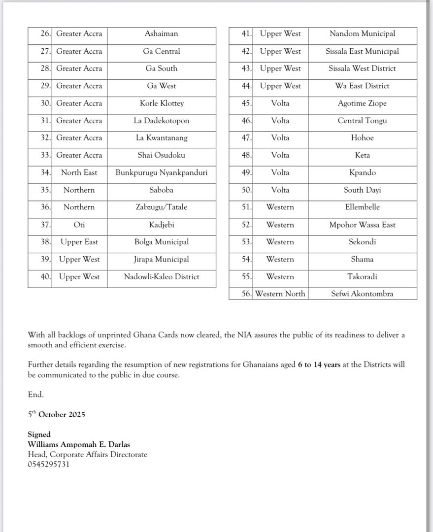 The NIA says the remaining districts will follow in the coming days and assures the public that all backlogs of unprinted Ghana Cards have been cleared.