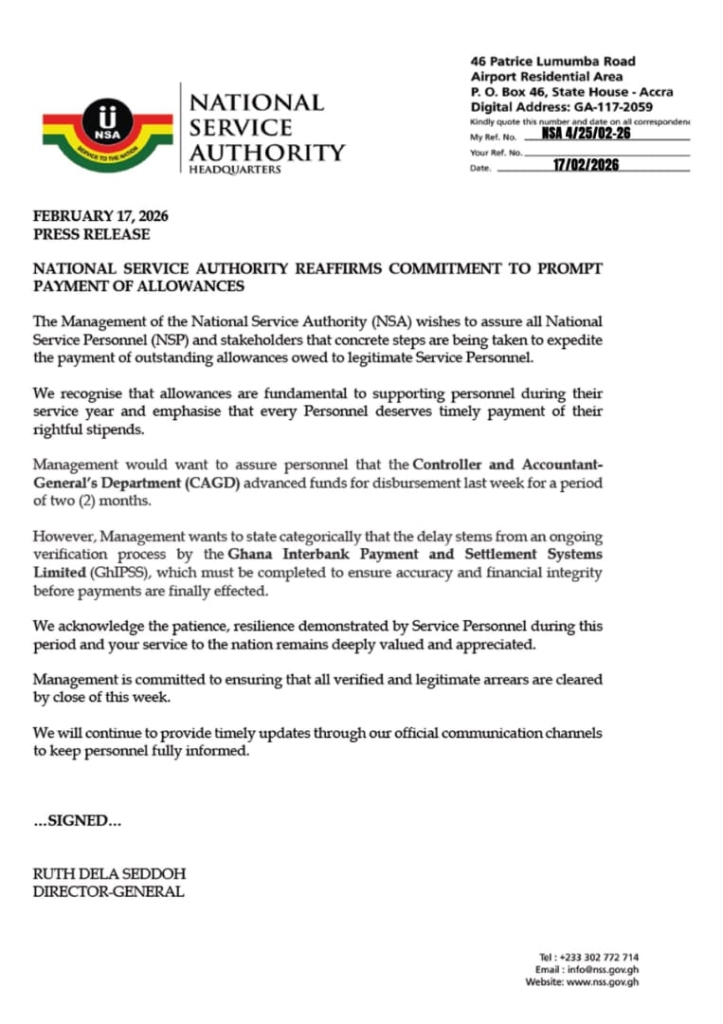 In a statement signed by the Director-General of the National Service Authority, Ruth Dela Seddoh, on February 17, 2026, management of the Authority said allowances remain critical to supporting personnel throughout their service year and stressed that every service person deserves timely payment of their rightful stipends.