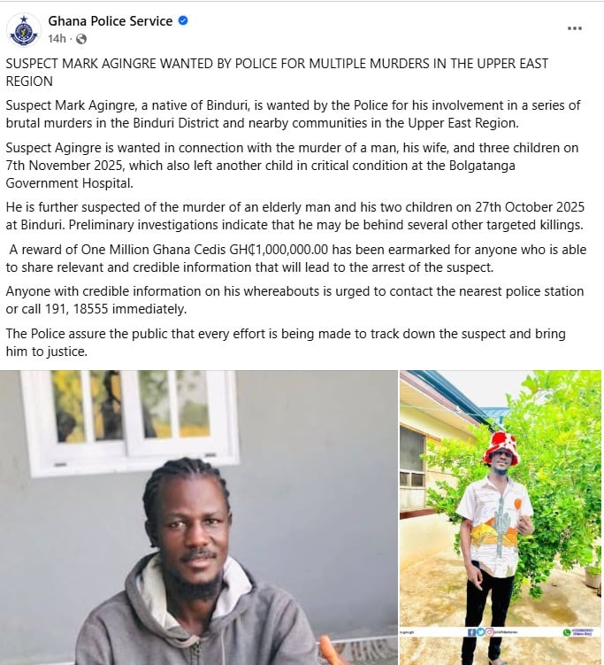 According to police reports, the suspect is wanted in connection with the murder of a man, his wife, and three children on November 7, 2025. This attack also left another child in critical condition at the Bolgatanga Government Hospital.
