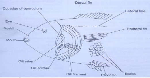 Make a drawing 8-10cm long of the side of the specimen from head to mid trunk, from the side from which the operculum has been removed.