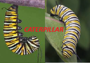- Name the missing stages in the life cycle involving the specimen (caterpillar) and its adult (a second specimen)