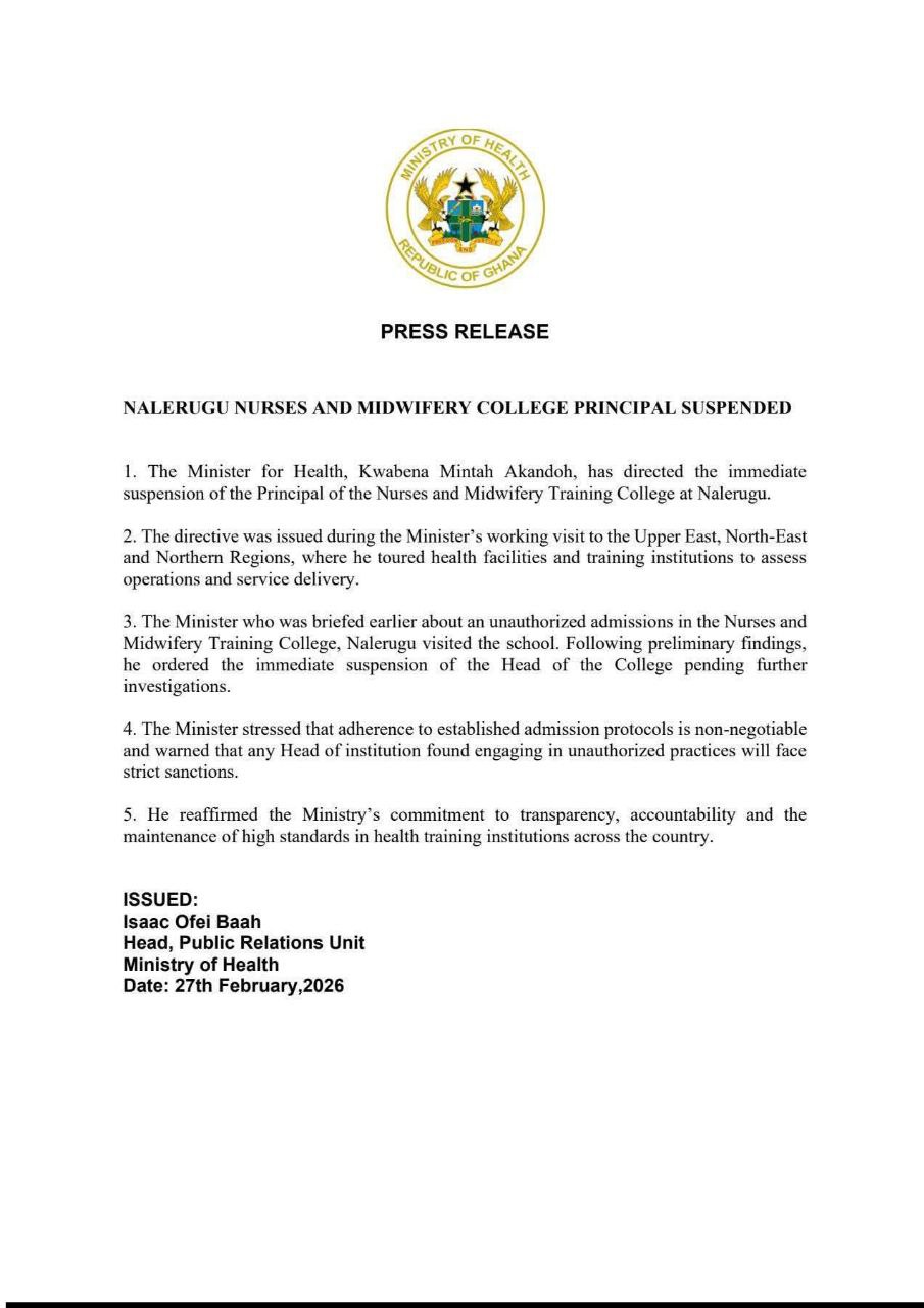 The Minister for Health, Kwabena Mintah Akandoh, has ordered the immediate suspension of the Principal of the Nurses and Midwifery Training College in Nalerigu in the North East region.