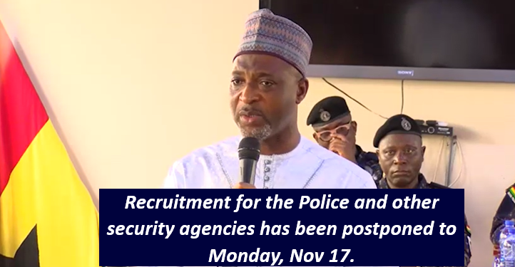 The Minister for the Interior, Muntaka Mubarak, has announced a postponement of the nationwide security services recruitment exercise, shifting the start date from Saturday, November 15, to Monday, November 17.