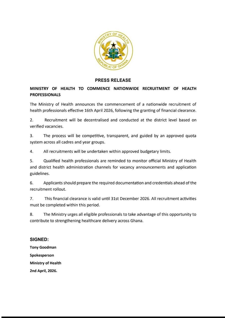 The Ministry of Health, in a press release signed by Tony Goodman, Spokesperson, Ministry of Health, on 2nd April 2026, announces the commencement of a nationwide recruitment of health professionals effective 16th April 2026, following the granting of financial clearance.